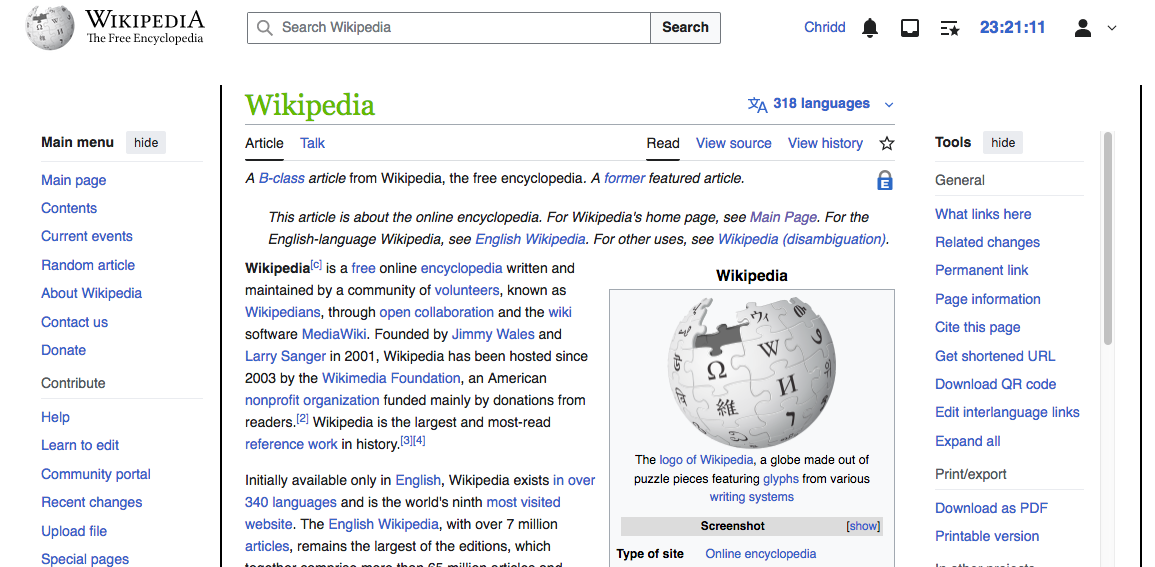 Wikipedia allows you to have custom JavaScript and CSS without needing extensions (if you have an account), and I've had customizations there since 2007. I use the MonoBook skin (enabled in Preferences > Appearance), so that's what these customizations assume. (These don't apply on mobile.)